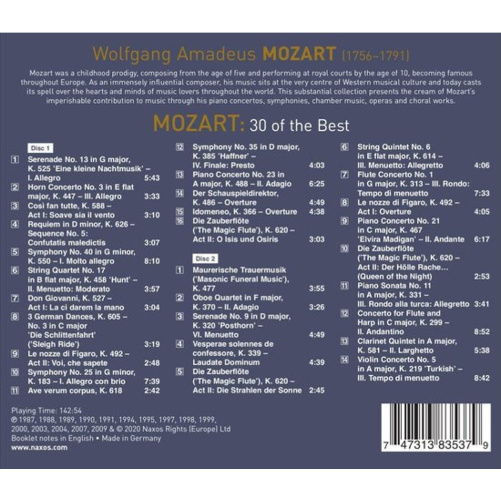 Deze uitgave op NAXOS met muziek van Wolfgang Amadeus Mozart wordt uitgevoerd door Jen? Jando - Capella Istropolitana - Moyzes Quarte. Dit prachtige artikel is nu verkrijgbaar op Klassiek.nl