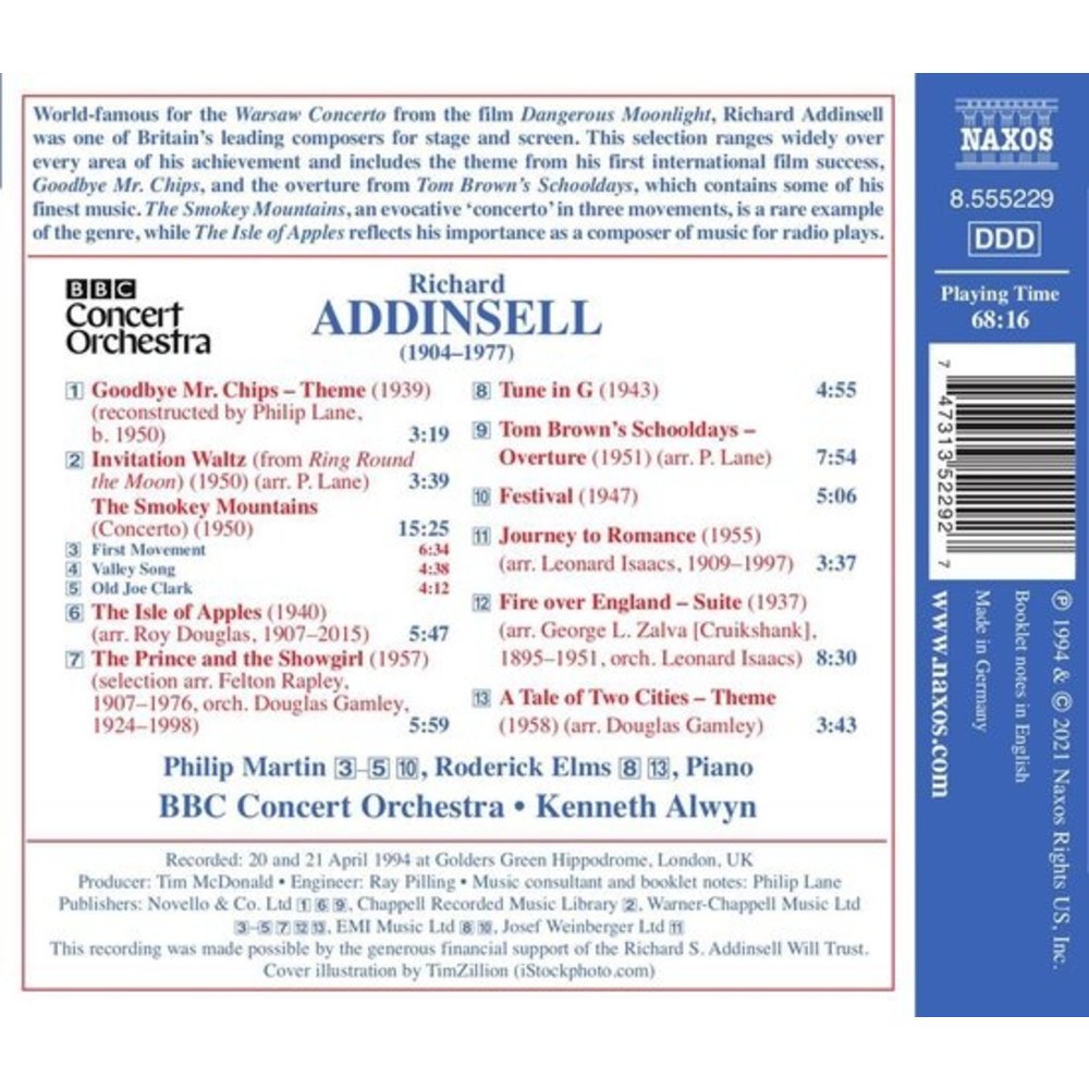 Richard Addinsell, wereldberoemd door het Warsaw Concerto uit de film Dangerous Moonlight, was een van de belangrijkste Britse componisten voor toneel en scherm. Deze selectie bestrijkt alle aspecten van zijn oeuvre en omvat het thema van zijn eerste internationale filmsucces, Goodbye Mr. Chips en de ouverture uit Tom Brown's Schooldays, die enkele van zijn beste muziekstukken bevat. The Smokey Mountains, een evocatief 'concerto' in drie delen, is een zeldzaam voorbeeld van het genre, terwijl The Isle of Apples zijn belang als componist van muziek voor hoorspelen weerspiegelt.