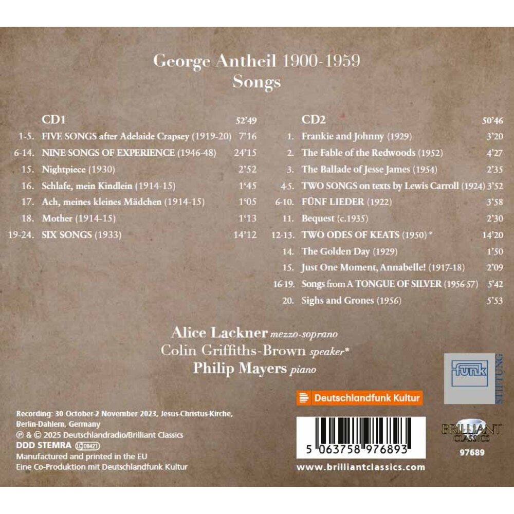 De liederen van Antheil zijn minder bekend, maar zeer boeiend. Deze vocale werken, geschreven in verschillende periodes van zijn carrière, laten een meer intieme en lyrische kant van de componist zien. Hoewel ze ver afstaan van de explosieve energie van zijn orkest- en pianomuziek, behouden zijn liederen zijn kenmerkende humor, ritmische precisie en inventieve harmonieën. Ze zijn vaak gebaseerd op teksten van dichters als James Joyce, Ezra Pound en andere literaire modernisten, wat Antheils diepe betrokkenheid bij hedendaagse intellectuele kringen weerspiegelt.