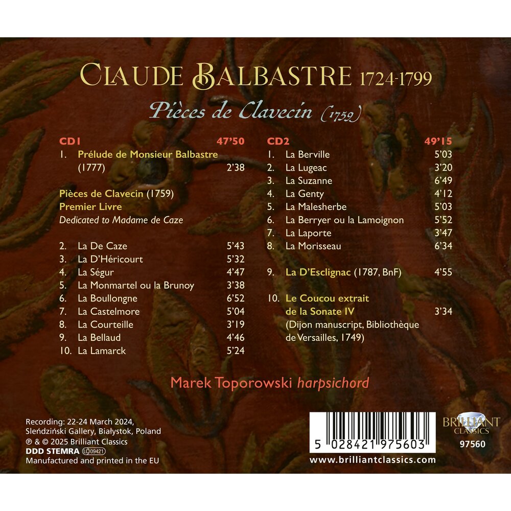 Claude Balbastre (1724-1799) was een vooraanstaand Frans componist, organist en klavecinist uit de late barok en vroege klassieke periode. Hij studeerde onder Claude Rameau, de broer van Jean-Philippe Rameau, wiens invloed duidelijk is in zijn muziek. Tot zijn meest opmerkelijke werken behoren zijn Pièces de clavecin, gepubliceerd in 1759. Deze stukken zijn een voorbeeld van de verfijnde en expressieve stijl van de Franse klavecimbeltraditie en combineren lyrische melodieën met ingewikkelde versieringen en levendige ritmes. Net als die van François Couperin en Jean-Philippe Rameau hebben de klavecimbelwerken van Balbastre vaak suggestieve titels, zoals La d'Héricourt, La de Caze en La Lugeac, verwijzend naar prominente figuren uit die tijd. Zijn Pièces de clavecin vertonen een breed scala aan texturen en stemmingen, van speelse en luchtige dansen tot diep expressieve bewegingen. Hij verwerkte elementen van de galante stijl, gekenmerkt door helderheid en gratie, naast meer dramatische en virtuoze passages, en paste soms zelfs orkestrale effecten toe op het klavecimbel. Marek Toporowski is klavecinist, organist, pianist en dirigent, een van de belangrijkste Poolse uitvoerders in de Historische Uitvoeringsbeweging. Hij is een geleerde en een bekend verzamelaar van historische instrumenten. Ook verkrijgbaar van Marek Toporowski zijn de Complete Piano Music van Pinto, klaviersonates van Hyacinthe Jadin en vioolsonates van Ferdinand Ries.