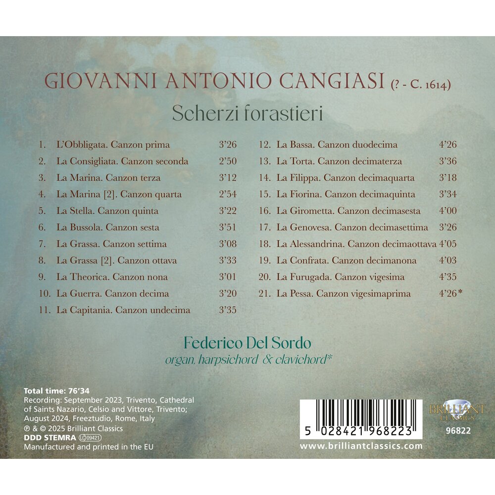 Giovanni Antonio Cangiasi, een Italiaanse componist en organist die actief was in de late 16e en vroege 17e eeuw. Cangiasi, geboren in Milaan, was een Franciscaner broeder die gedurende zijn carrière verschillende gewaardeerde posities bekleedde. Van 1588 tot minstens 1590 was hij organist van de kathedraal van Vercelli, en in 1614 werd hij benoemd tot organist van de Chiesa Maggiore in Castelnuovo Scrivia. Van Cangiasi's bewaard gebleven werken vormt de "Scherzi Forastieri per suonare a quattro voci", gepubliceerd in Milaan in 1614, zijn belangrijkste verzameling. Dit opus bestaat uit instrumentale canzona's voor vier stemmen, en is een voorbeeld van de ingewikkelde polyfone stijl die kenmerkend is voor de late Renaissance. De term "scherzi forastieri" kan vertaald worden naar "buitenlandse grappen", wat duidt op een verzameling doordrenkt met speelse en diverse muzikale ideeën. Elk stuk in de collectie draagt een aparte titel, zoals "La Stella", "La Guerra" en "La Marina", die kunnen verwijzen naar hedendaagse figuren, gebeurtenissen of abstracte concepten, die inzicht geven in het culturele en sociale milieu van die tijd. Gespeeld op clavichord en klavecimbel door Federico Del Sordo, een van de meest vooraanstaande Italiaanse musici en geleerden op het gebied van oude muziek, met een indrukwekkende discografie op zijn naam.