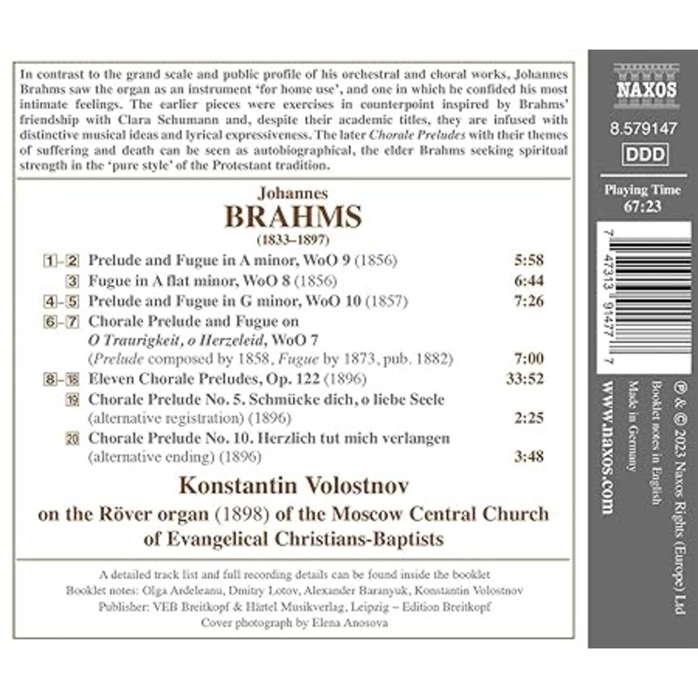 De Russische organist Konstantin Volostnov voert de complete orgelwerken van Brahms uit op het Röver-orgel van de Moskouse Centrale Kerk van Evangelische Christenen-Doopsgezinden. Het instrument werd gebouwd in 1898 en had jarenlang moeten lijden onder verwaarlozing, maar is opmerkelijk genoeg een van de enige Röver-orgels die volledig origineel en intact zijn gebleven.