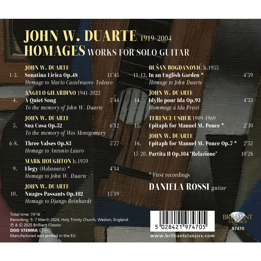 John Duarte (1919-2004) was een van de belangrijkste en invloedrijkste gitaristen en gitaarcomponisten van de 20e eeuw. Zijn werk laat een uitzonderlijk breed scala aan stijlen zien. Sommige werken weerspiegelen de Renaissance stijl van hofluitisten zoals John Dowland, andere werken wisselen in stijl af tussen aleatorisch, atonaal en grafisch, binnen een conventioneel genoteerd kader en met ruimte voor spontane reacties tussen de uitvoerenden. In veel andere werken gebruikt hij een tonale taal, vaak gekleurd door de volksmuziektradities van verschillende naties, en romantisch van stemming. In de loop van zijn 66-jarige carrière als componist sloot Duarte vele vriendschappen met uitvoerders en componisten. Deze opname documenteert de geschiedenis van deze relaties en bevat ook drie hommages van andere componisten aan Duarte. De componisten op deze nieuwe opname zijn Dusan Bogdanovic, Terence Usher, Mark Houghton en Angelo Gilardino. Met grote beheersing en gevoel gespeeld door de Italiaanse gitariste Daniela Rossi, door componist/gitarist Leo Brouwer omschreven als “...een performer met een zeer zeldzame combinatie van energie, expressie en perfecte techniek”.