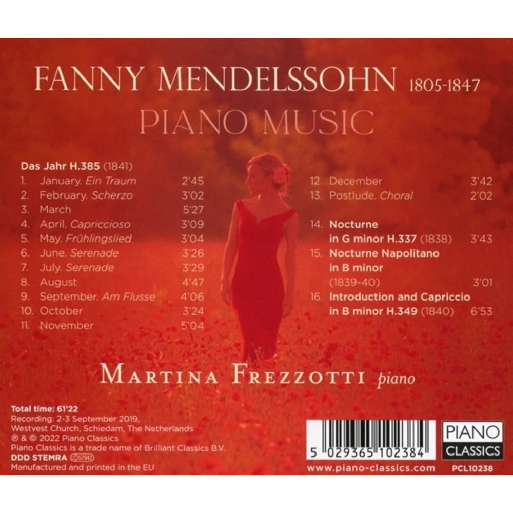 ‘Felix Mendelssohn is al een volwassen artiest, en hij is nog maar vijftien! [...] Zijn oudere zus Fanny, ook enorm getalenteerd, speelde enkele van Bachs fuga's en passacaglia's uit het hoofd en met een bewonderenswaardige precisie. Ik geloof dat ze met recht 'een goede muzikante' genoemd kan worden..." Aldus schreef Moscheles in zijn dagboek, in 1818. Fanny Mendelssohn Hensel werd in november 1805 in Hamburg geboren, als oudste van vier broers en zussen (de tweede was Felix, gevolgd door Rebecca en Paul). De familie Mendelssohn, van Joodse afkomst en behorend tot de hogere bourgeoisie, gaf hun vier kinderen een briljante culturele opvoeding. Fanny was niet alleen een uitzonderlijk pianiste, maar ook een uitstekend componiste; haar stijl ligt heel dicht bij die van Felix, de bekendste van haar broers en zussen. Haar oeuvre is rijk en omvangrijk en omvat meer dan vierhonderd stukken, waaronder liederen, orgelwerken, kamermuziek, cantates, een oratorium en een orkestouverture. Ondanks haar productieve creatieve output, zijn sommige van haar werken nog steeds ongepubliceerd. Deze CD concentreert zich op een deel van haar pianowerken, geschreven tussen 1838 en 1841, die bijzonder interessant zijn. De pianocyclus Das Jahr (Het jaar) (1841) is het hoofdwerk van deze verzameling, geschreven tijdens haar Italiaanse reis. Het bestaat uit twaalf stukken, elk met de naam van een maand, plus een epiloog, die elk de specifieke gevoelens en sfeer van de maand in kwestie uitdrukken. Er zijn veel thematische kruisverwijzingen tussen de stukken, evenals talrijke verwijzingen naar Bach. Ook opgenomen zijn de twee Nocturnes en de Introduction & Rondo Capriccioso in B minor, waarin de invloed van haar broer Felix bijzonder duidelijk is. De Italiaanse pianiste Martina Frezzotti studeerde bij Lazar Berman aan de Piano-academie van Imola en later bij Elisso Virsaladze aan het prestigieuze Tsjaikovski Conservatorium in Moskou, waar ze in 2012 haar doctoraat in de muziek behaalde met de hoogste cijfers, als eerste Italiaanse in de geschiedenis van dit prestigieuze instituut. In 2012 maakte ze haar debuut in de New Yorkse Carnegie Hall.
