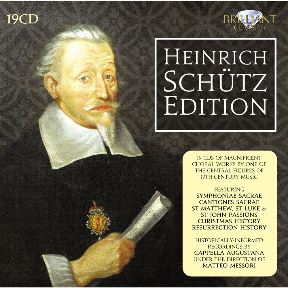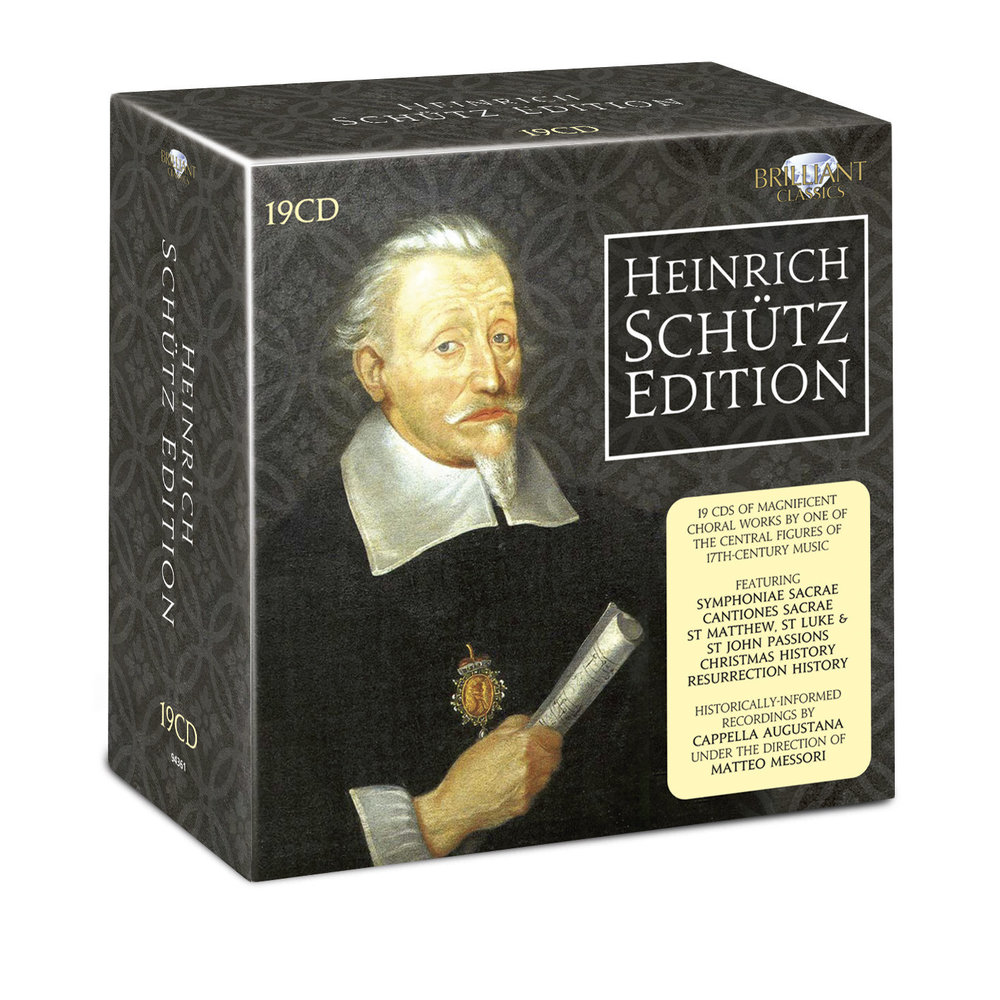 Het werk van Schütz wordt vaak overschaduwd door dat van zijn beter bekende Italiaanse tijdgenoot Claudio Monteverdi. Evenals zijn opvolger in de Lutherse muziek J.S. Bach, waren Schütz' bijdragen aan de 17e-eeuwse kerkelijke muziek significant. Met een carrière die een tijdperk van grote muzikale ontwikkelingen overspant, onthullen zijn composities een rijk scala aan invloeden die een inspiratie voor toekomstige generaties componisten waren. De box bevat de belangrijkste composities (meestal grootschalige werken) die Cappella Augustana selecteerde uit het oeuvre van de Duitse componist. Deze uitgebreide collectie van Schütz' werken is van uitstekende kwaliteit en, gezien de samenstelling, uniek te noemen.