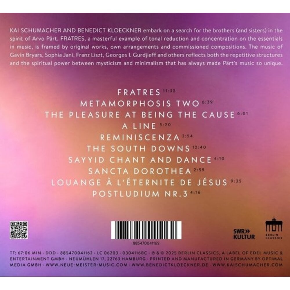 Fratres is een cd uit 2025 waarbij cellist Benedict Kloeckner en pianist Kai Schumacher voor het eerst samen een artistieke samenwerking aangaan. Ze verkennen met dit album de mystieke en minimalistische kanten van de klassieke muziek, met een focus op de eigentijdse klassieke stroming waarin minimalisme en verstilling centraal staan.