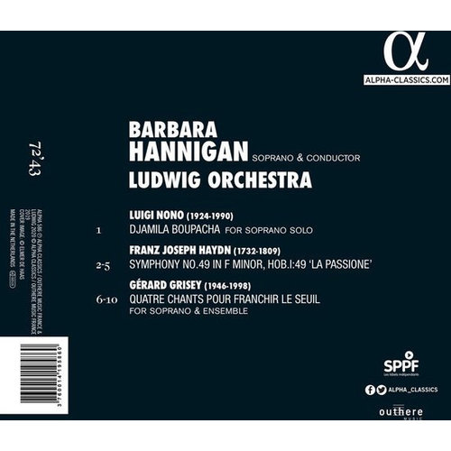 Het uitgangspunt voor Barbara Hannigan's derde opname voor Alpha is een werk van Gérard Grisey (1946-98) dat haar bijzonder nauw aan het hart ligt. Grisey schreef: 'Ik heb de Quatre Chants pour franchir le seuil [vier liedjes om de drempel over te steken] opgevat als een muzikale meditatie over de dood in vier delen: de dood van de engel, de dood van de beschaving, de dood van de stem en de dood van de mensheid ... De gekozen teksten behoren tot vier beschavingen (christelijke, Egyptische, Griekse, Mesopotamische) en hebben een fragmentarisch discours over de onvermijdelijkheid van de dood gemeen. ' Luigi Nono (1924-90) was een politiek geëngageerde componist. Zijn verbluffende monodie Djamila Boupacha, een hartverscheurende roep om solo-sopraan, is een eerbetoon aan een vrijheidsstrijder die tijdens de Algerijnse oorlog door Franse parachutisten is gemarteld; Picasso portretteerde haar ook in houtskool. Barbara Hannigan zingt en regisseert dit tweetal twintigste-eeuwse werk opnieuw met haar vrienden van het Ludwig Orkest. Ze heeft ervoor gekozen om ze te combineren met een klassieke symfonie van de meester van het genre, Joseph Haydn, die ook het thema van de passie behandelt. Haar interpretatie is buitengewoon intens en zeer persoonlijk.