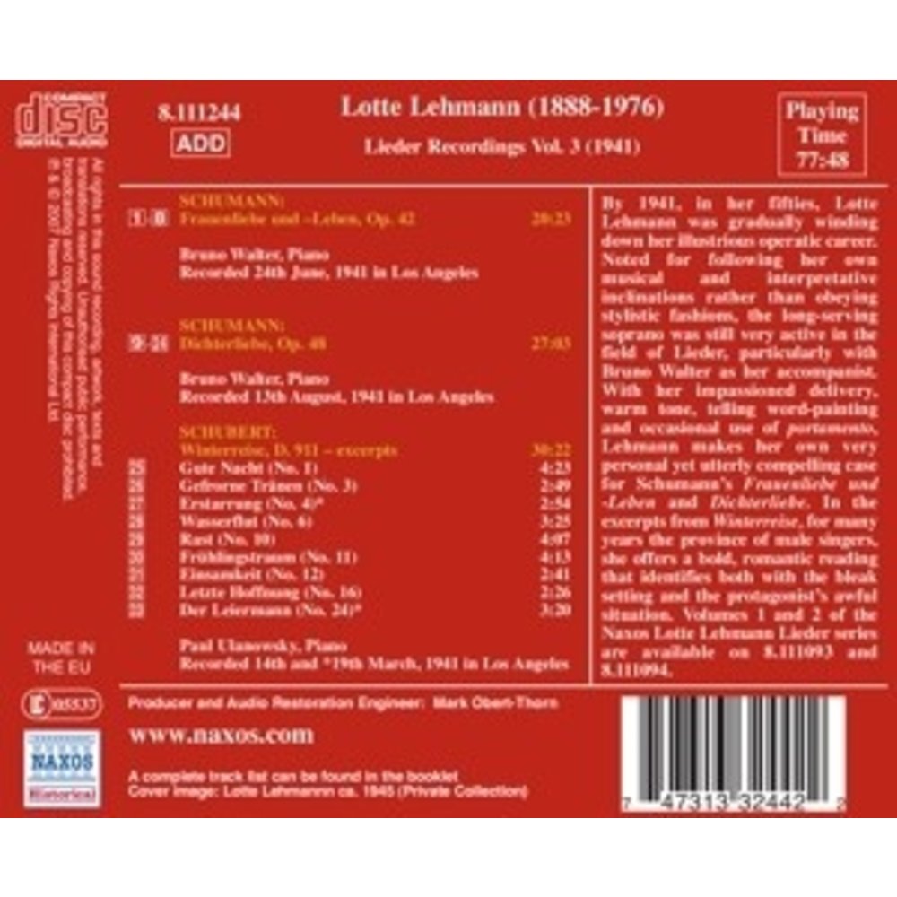 Deze uitgave op NAXOS HISTORICAL met muziek van Schumann/Schubert wordt uitgevoerd door Lehmann,Lotte. Dit prachtige artikel is nu verkrijgbaar op Klassiek.nl