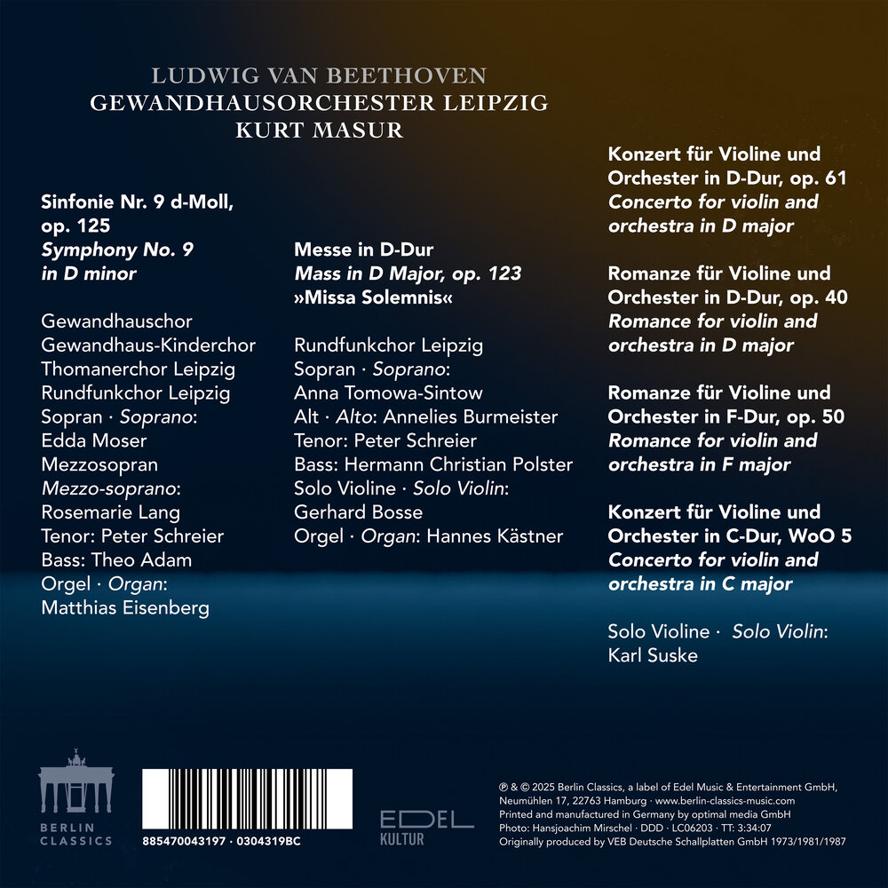 Deze 3-cd-collectie presenteert de samenwerking tussen Kurt Masur en het Gewandhausorchester Leipzig in drie van hun unieke Beethoven-uitvoeringen uit de jaren 80. Het middelpunt is de opname van de Negende symfonie, gemaakt ter gelegenheid van het openingsconcert van het nieuwe Gewandhaus in Leipzig op 8 oktober 1981. Het is grotendeels te danken aan de inspanningen van Kurt Masur, dirigent van het orkest vanaf 1970, dat er na de Tweede Wereldoorlog een nieuw, ‘derde’ Gewandhaus werd gebouwd aan de Augustusplatz in het centrum van de stad. Het openingsconcert van het nieuwe Gewandhaus op 8 oktober 1981 markeerde dan ook het begin van een nieuw tijdperk voor het orkest onder leiding van zijn toenmalige chef-dirigent.