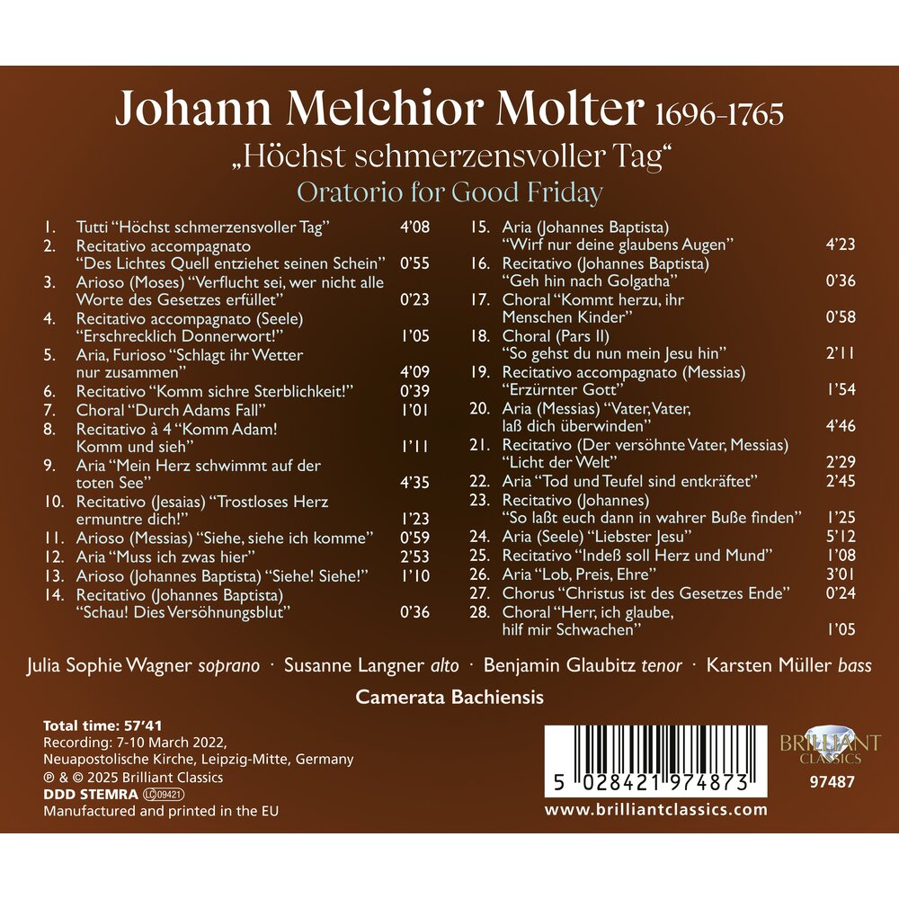 Johann Melchior Molter werd in 1696 geboren in Thüringen, waar zijn muzikale talent al snel werd erkend. Hij zat in het orkest aan het hof van Karlsruhe. Later verbreedde hij zijn horizon door naar Italië te gaan, waar hij Albinoni, Vivaldi en Alessandro Scarlatti ontmoette. Hij nam hun melodieuze gaven over, bestudeerde hun instrumentale vaardigheden en ging terug naar Karlsruhe, waar hij de rest van zijn leven als hofcomponist doorbracht. Molters werken zijn feestelijk en ceremonieel, een gelukkige mix van Duits contrapunt, Italiaanse glans en Franse grandeur. Deze nieuwe opname presenteert het grootschalige Oratorio Höchst schmerzenvoller Tag", geschreven voor Goede Vrijdag. Het werk volgt het model van het lijdensoratorium, dat vanaf het begin van de 18e eeuw erg populair was in het protestantse Duitsland. Het lijden en sterven van Christus wordt niet uitgebeeld door middel van citaten uit de lijdensverhalen van het Nieuwe Testament, maar becommentarieerd en gereflecteerd door middel van hedendaagse poëzie. De muziek is gedurfd en dramatisch en drukt het lijden van Christus uit in ontroerende aria's, recitatieven en koralen. Uitgevoerd door Julia Sophie Wagner (sopraan), Susanne Langner (alt), Benjamin Glaubitz (tenor), Karsten Müller (bas) en het Ensemble Camerata Bachiensis, spelend op historische instrumenten.