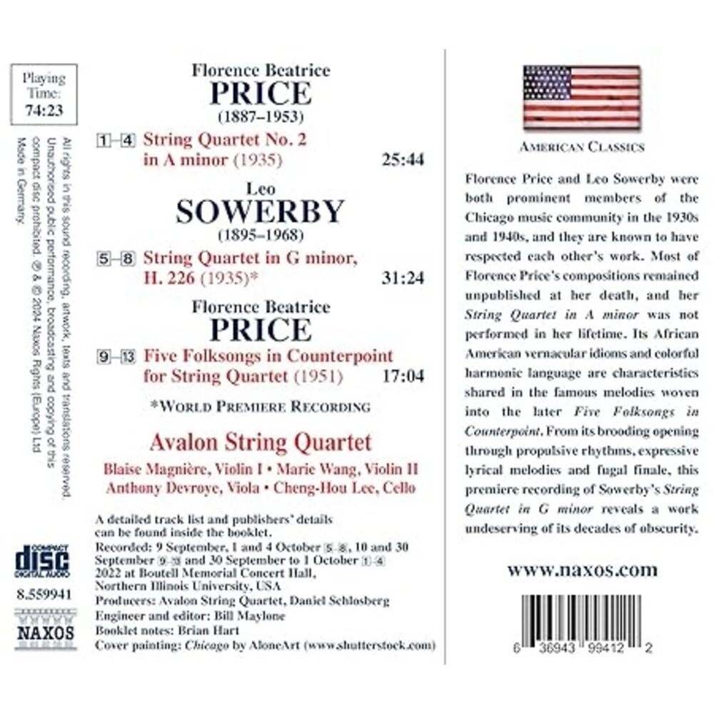 Naxos' verkenning van het werk van Florence Price gaat verder met dit album met muziek voor strijkkwartet. Price en Leo Sowerby waren tijdgenoten in de Chicago muziekgemeenschap van de jaren 1930 en 1940, en het is bekend dat ze elkaars werk respecteerden. Sowerby's String Quartet in G minor is een wereldpremière. Uitgevoerd door het Avalon String Quartet, een van Amerika's toonaangevende kamermuziekensembles.