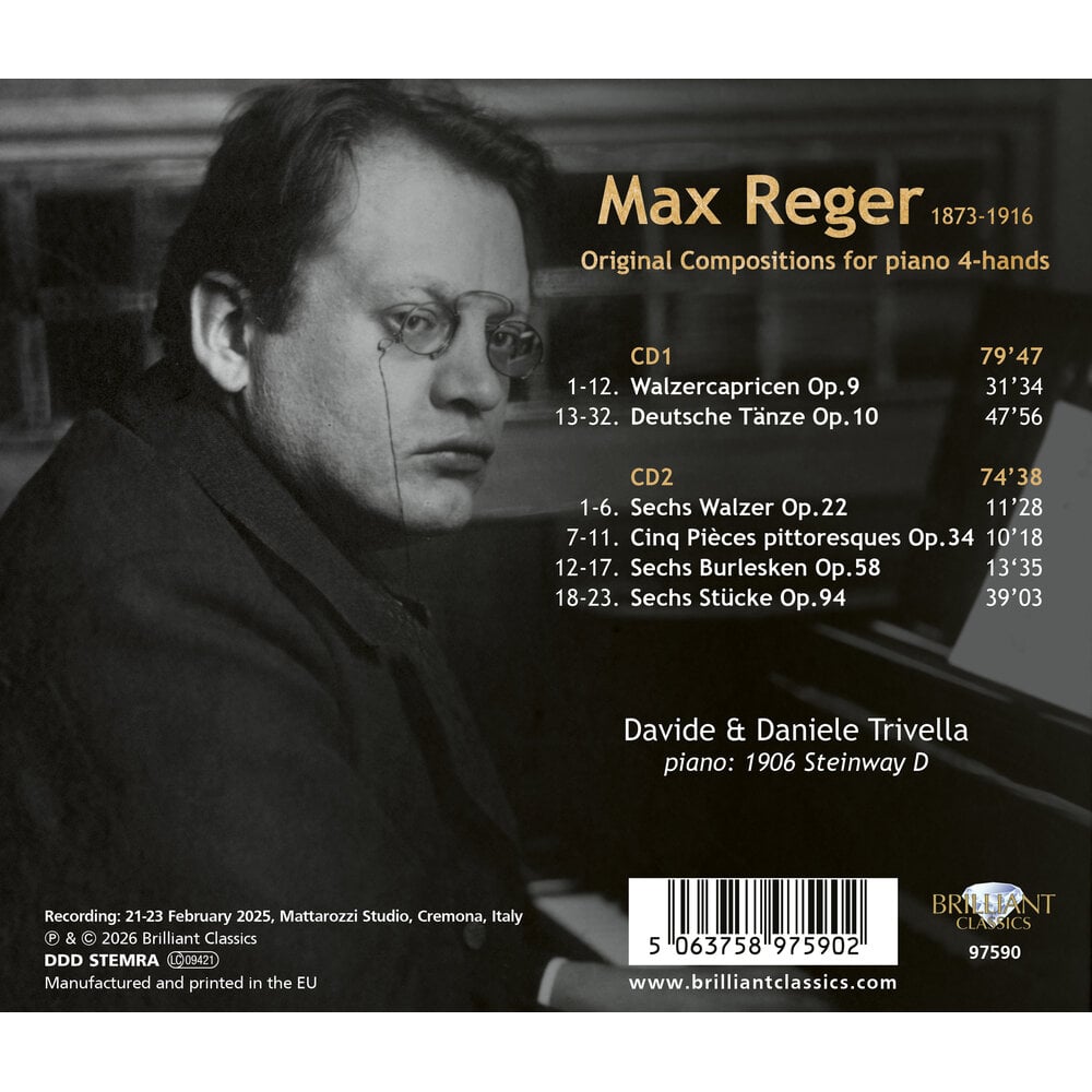 Max Reger (1873-1916) was een Duitse componist, pianist en dirigent wiens muziek een brug sloeg tussen de late romantiek en de vroege moderne tijd. Reger stond onder grote invloed van J.S. Bach, Beethoven en Brahms en stond bekend om zijn contrapuntische meesterschap en harmonische rijkdom. Hoewel zijn reputatie vaak berustte op zijn orgel- en kamermuziek, biedt zijn oeuvre voor piano vierhandig een onthullende blik op zijn compositorische persoonlijkheid, met zowel zijn intellectuele strengheid als zijn warme expressie.