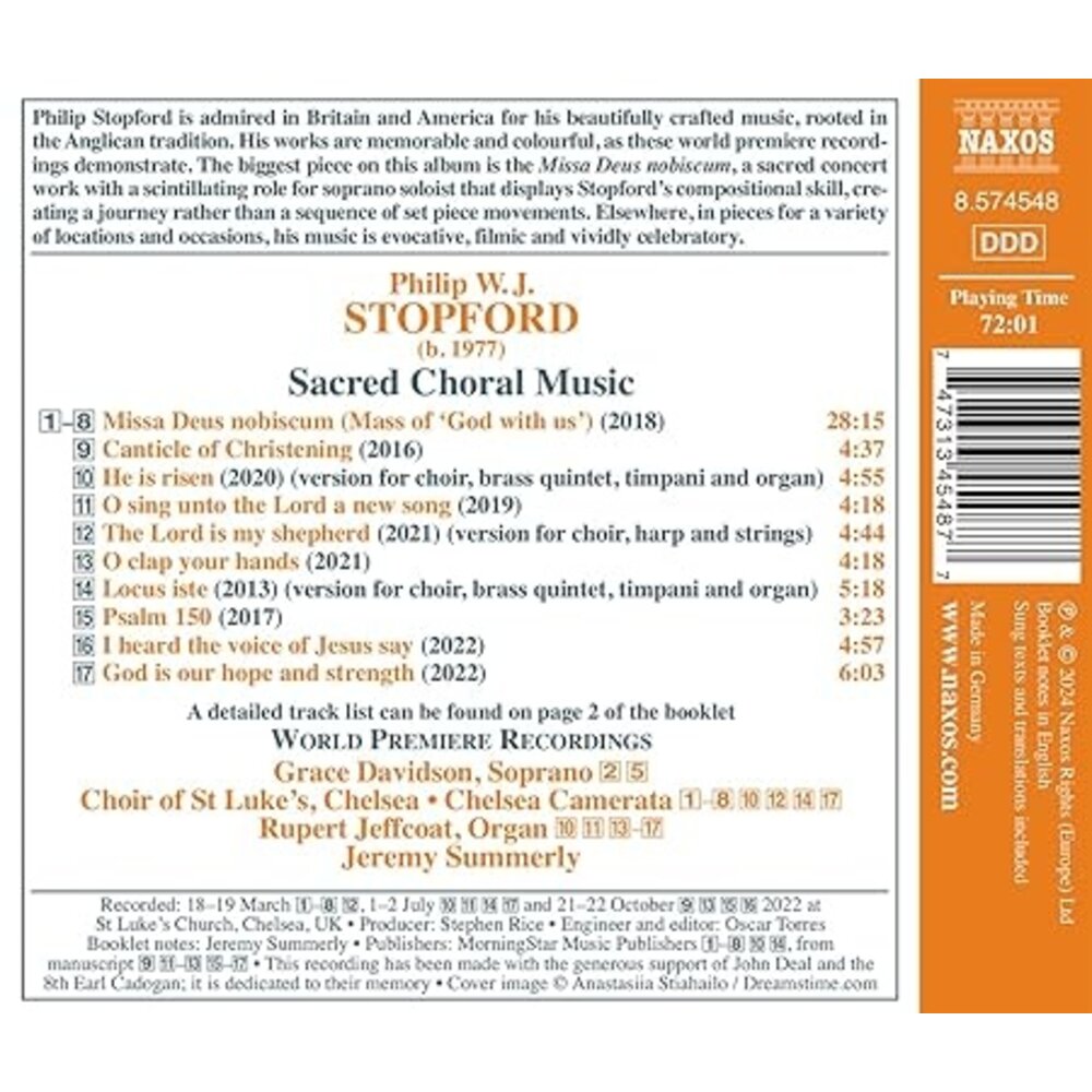 Philip Stopford is een Britse componist die in Groot-Brittannië en Amerika wordt bewonderd om zijn prachtig vormgegeven muziek, geworteld in de Anglicaanse traditie. Dit programma van wereldpremière opnames bevat de substantiële Missa Deus nobiscum. Alle werken worden gedirigeerd door Jeremy Summerly, met het Choir of St. Luke's, en de Chelsea Camerata.