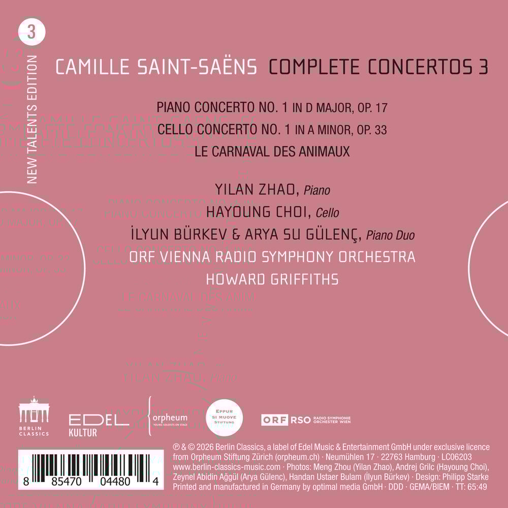 De Saint-Saëns-reeks wordt voortgezet met de derde uitgave. Alle opnames zijn gemaakt met het ORF Radio-Symphonieorchester Wien onder leiding van Howard Griffiths. Dit derde album bevat ’Het carnaval der dieren’, ’Concert voor cello en orkest nr. 1 in a mineur, op. 33’ en ’Concert voor piano en orkest nr. 1 in D majeur, op. 17’. Uitgevoerd door de jonge talenten Yilan Zhao (piano), Hayoung Choi (cello) en het pianoduo Arya Su Gülenç en Ilyun Burkev.