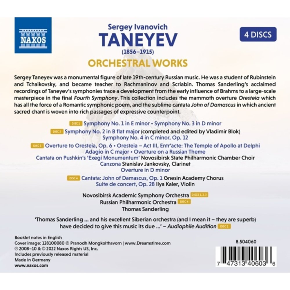 Sergej Tanejev was een monumentale figuur in de laat 19e-eeuwse Russische muziek. Hij was een leerling van Rubinstein en Tchaikovsky, en werd leraar van Rachmaninov en Scriabin. Thomas Sanderlings veelgeprezen opnamen van Taneyevs symfonieën laten een ontwikkeling zien van de vroege invloed van Brahms naar een groots meesterwerk in de laatste Vierde Symfonie. Deze collectie omvat de mammoet ouverture Oresteia die alle kracht heeft van een romantisch symfonisch gedicht, en de sublieme cantate Johannes van Damascus waarin het oude sacrale gezang verweven is met rijke passages van expressief contrapunt.