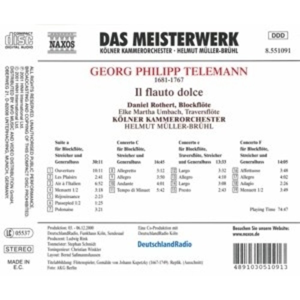 Deze uitgave op NAXOS met muziek van Telemann,Georg Philipp wordt uitgevoerd door Rothert,Daniel/Muller-Bruhl/Kk. Dit prachtige artikel is nu verkrijgbaar op Klassiek.nl