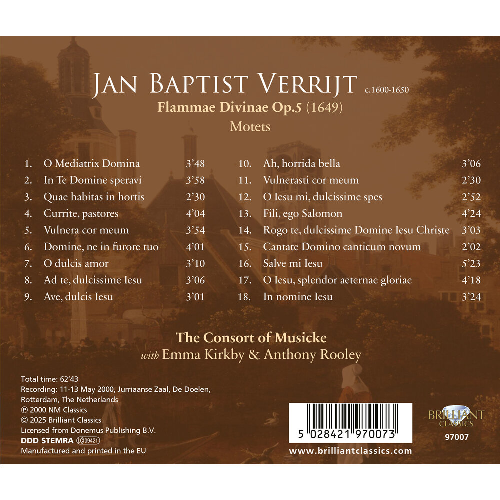 Jan Baptist Verrijt (geboren rond 1600 in Oirschot en overleden in Rotterdam in 1650) was samen met Jan Pieterszoon Sweelinck misschien wel de belangrijkste Nederlandse componist van de zeventiende eeuw. Zijn belangrijkste bewaard gebleven werk, Flammae divinae, opus 5, bestaat uit zes tweestemmige en twaalf driedelige motetten samen met twee driedelige zettingen voor de mis, en werd gepubliceerd in de periode dat Verrijt als organist in dienst was van de Grote Sint-Laurenskerk in Rotterdam (1644-50). In dit werk toont Verrijt een uitmuntend meesterschap in het combineren van de levendigheid van de nieuwe Italiaanse stile concertato met de polyfone technieken van de oude Franco-Vlaamse school. De muziek klinkt fantasierijk en dramatisch, maar is tegelijkertijd evenwichtig en beheerst. Net als Claudia Monteverdi verlevendigt Verrijt zijn complexe meerstemmige kerkmuziek met technieken ontleend aan het madrigaal en de opera, waarbij hij de oude imitatieve technieken op een nieuwe manier gebruikt om een sterk emotioneel effect te bereiken. Uitgevoerd door een van de meest prominente en baanbrekende Oude Muziek vocale ensembles van de 20e eeuw, het Consort of Musicke, met Emma Kirkby, en gedirigeerd door Anthony Rooley. Een heruitgave van het NM Classics label, het label voor muziek uit Nederland.