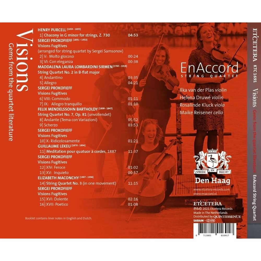 Aangezien de 'Visions fugitives' van Sergei Prokofiev centraal staan in deze opname, is Visions een passende titel voor een CD gewijd aan werken die sterk verschillen in stijl, sfeer en artistieke intentie. De werken omvatten de gracieuze hofmuziek van Henry Purcell, de elegant klassieke wereld van Maddalena Lombardini, de verheven passies van Guillaume Lekeu, de existentiële angsten van Elizabeth Maconchy, de beheerste romantiek van Mendelssohn en het muzikale iconoclasme van Stravinsky.nVisions' laat de luisteraar kennismaken met een voortdurend veranderende wereld en weerspiegelt de vele vormen die muziek voor een strijkkwartet kan aannemen. De leden van het EnAccord Strijkkwartet brengen niet alleen een energieke overtuigingskracht maar ook uitstekende technische vaardigheden en een groot muzikaal inzicht in hun uitvoeringen. Ze zijn winnaars van verschillende belangrijke wedstrijden en hebben in hun twintigjarige carrière een solide basis opgebouwd van zowel fans als critici.