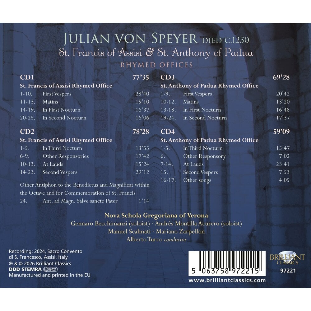 Onlangs opgenomen in de basiliek van Assisi, de geboorteplaats van de franciscaanse orde, een uitgebreide verzameling van de ‘Rhymed Offices’ die door religieuze gemeenschappen worden gezongen om te getuigen van de wonderen en deugden van de heilige Franciscus en de heilige Antonius van Padua.