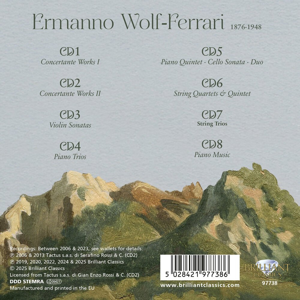 Een nieuwe uitgave in de Brilliant Classics serie “The Italian Romantics”, een eerbetoon aan het rijke erfgoed van instrumentale (in tegenstelling tot vocale, operamuziek) muziek van Italiaanse componisten in de Romantiek/Late Romantiek. Ermanno Wolf-Ferrari (1876-1948) is een componist die moeilijk te classificeren is. Als kind van zijn tijd hield hij zich afzijdig van de vernieuwingen van de modernisten en de dodecafonie. Als zoon van een Duitse vader en een adellijke Venetiaanse moeder werd hij geboren in Venetië en ging hij studeren in München. Hij werd beroemd als operacomponist. Zijn stijl is romantisch, getint met impressionisme en af en toe een neoklassieke zweem. Zijn doel was om een “universele schoonheid” te creëren in zijn werken, waar geen regels gelden, maar alleen een gevoel van welzijn en sensualiteit. Deze uitgebreide set van 8 cd's bevat concertante werken: vioolconcert, hoboconcertino, serenade voor strijkers, concertino voor Engelse hoorn en concertino voor fagot, hoorns en strijkers. De complete kamermuziek bevat de vioolsonates, cellosonate, pianotrio's, pianokwintet, strijktrio's, kwartetten en kwintet. De laatste cd bevat werken voor piano solo. Uitstekende uitvoeringen door Italiaanse musici, die hun diepe liefde voor de muziek van hun landgenoot uitdrukken.